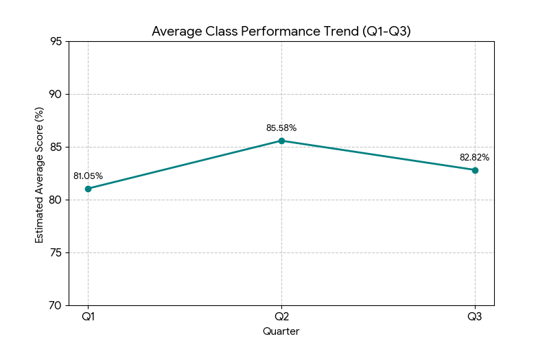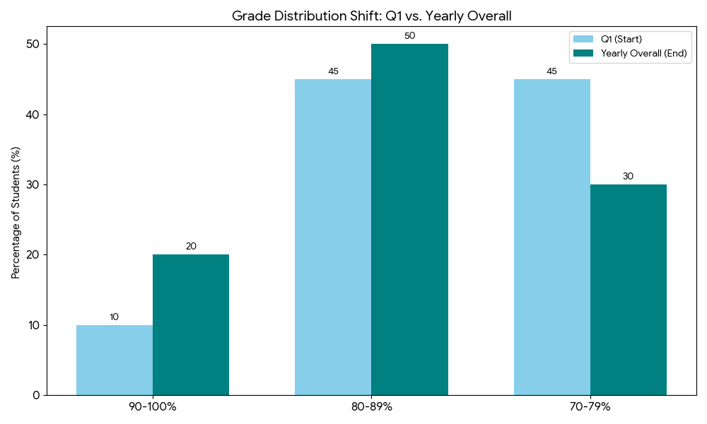 This data demonstrates measurable improvement in student outcomes over one academic year, including a doubling of high-achieving students (90–100%) and a significant reduction in students in the 70–79% band.