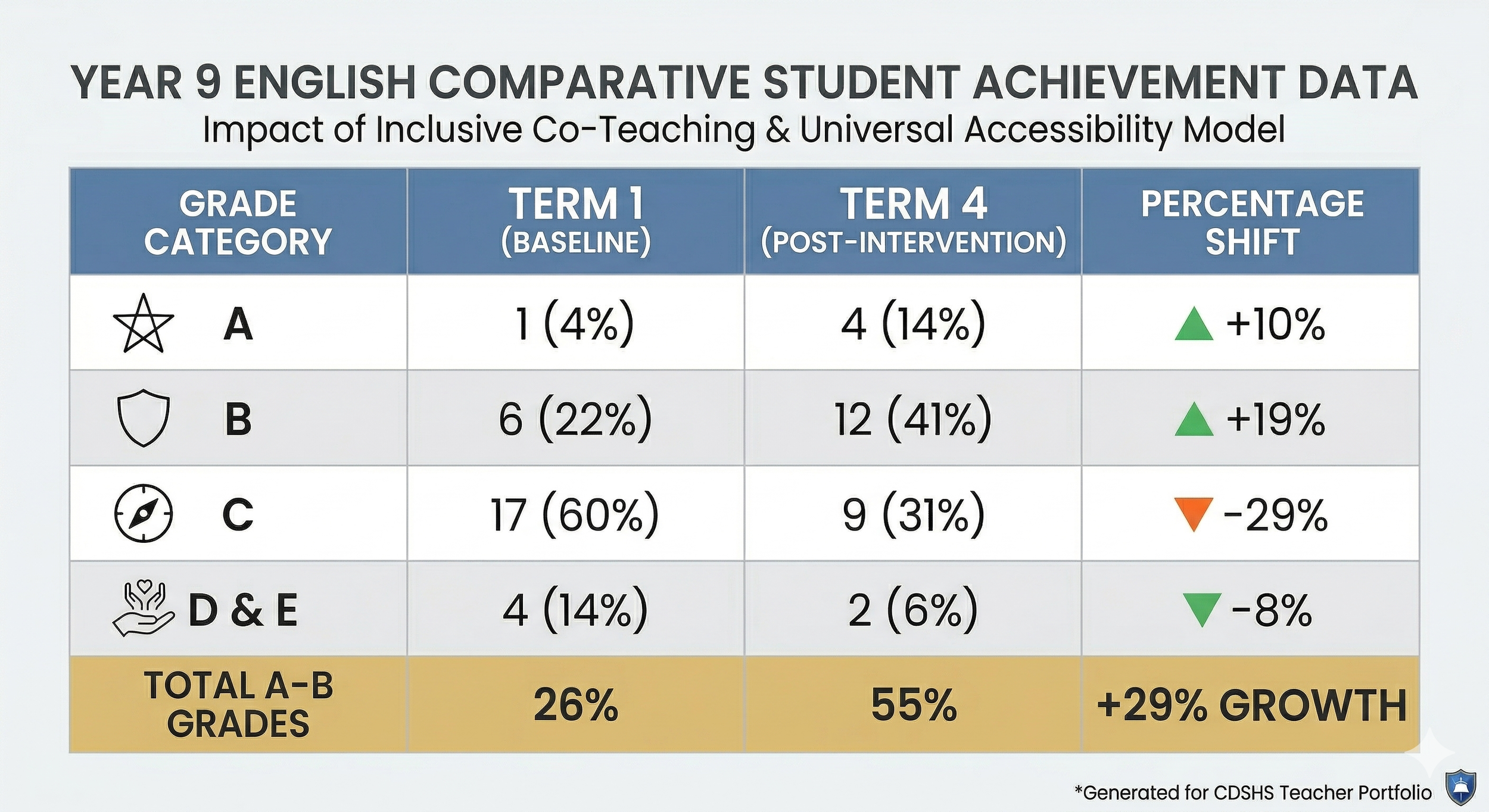In 2020, at Cleveland District State High School, I champion a shift toward inclusive education by advocating for the integration of students with high learning needs into my mainstream Year 9 English classroom. Collaborating closely with the Student Support team, I co-designed a sustainable co-teaching and differentiation model that prioritized universal accessibility over simple curriculum modification. This framework has since been institutionalized as standard practice across the school, with longitudinal data validating its success in improving both engagement and academic outcomes.